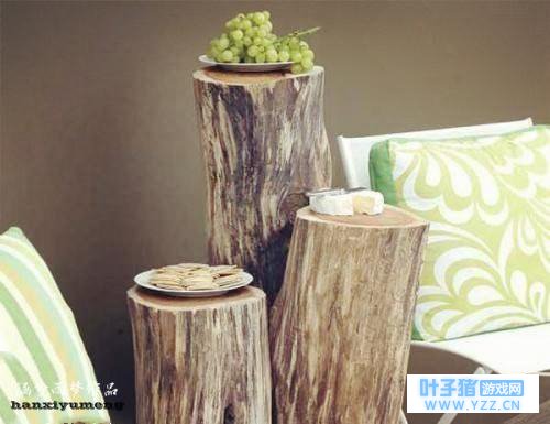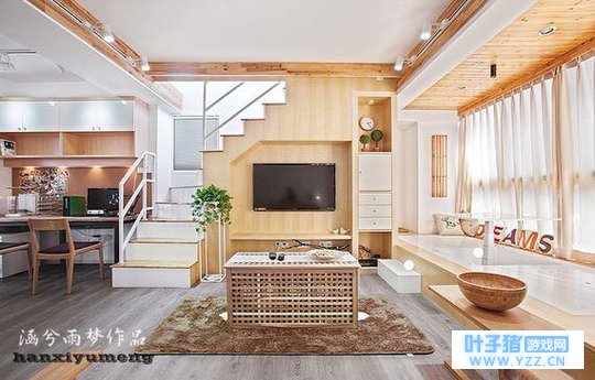 第二,看室内,原木家具,可以看到年轮的餐桌,沙发茶几!很 日式自然风, 全部取材于自然环境,非常适合日常修真成妖, 平时就在树桩小茶几上看着年轮,喝着茶,十分地佛系。