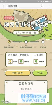 《旅行青蛙:中国之旅》开启内测,淘宝APP首发 5月3日,《旅行青蛙》中国版在淘宝APP独家开启限量内测,正式名称为《旅行青蛙:中国之旅》。用户可前往淘宝APP搜索“旅行青蛙”,进入内测页面(需要授权),目前采取邀请制。也就是说,在页面指定位置输入激活码(邀请码),才能进入 测试 、提前体验游戏。