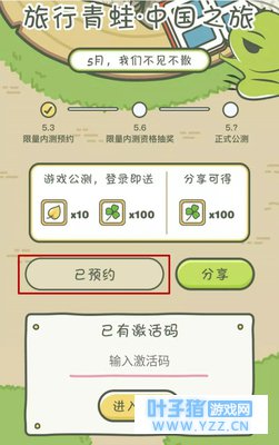 ▲邀请码输入界面,流程同“预约方式” 就目前网上曝光的多张游戏截图来看,此款游戏被命名为 《旅行青蛙:中国之旅》 ,可以看做是原版游戏的“番外篇”。