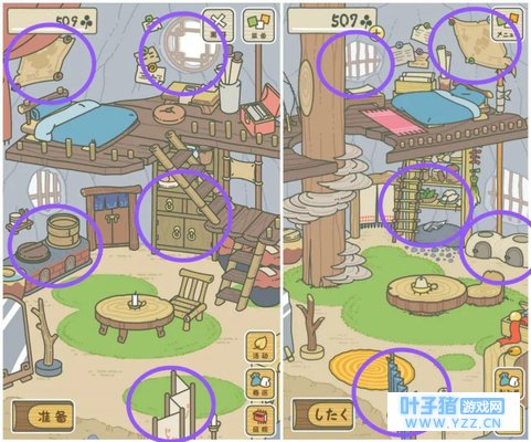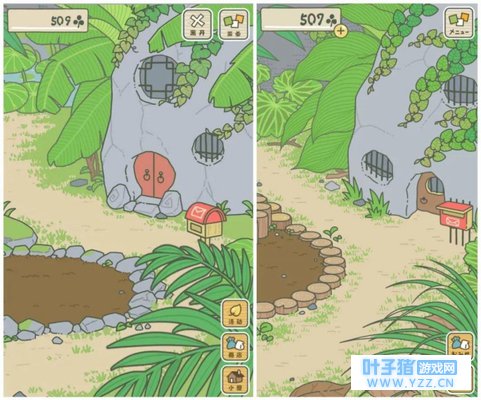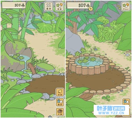↑左:中国版;右:日本版 (中国版的小院儿图:@墨语默雨) 再来看看你的四叶草地那一边 木头桩子都换成了 石头 小水池换成了 小水缸 在水缸里养花植草在我国确实常见 另外中国版上方还开辟了 新的荷花池哦