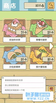 如果说庭院和房间看起来差别还不大的话,食物、装备开始就完全不一样了。食物上中西结合,既有西式的奶油华夫饼、草莓可丽饼、沙拉皮塔饼,也有中式的茄汁蛋包饭、香葱烤包子、海苔煎豆腐。
