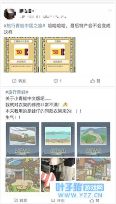 小妖和几个朋友同时都拿到了邀请码,在玩的过程中却发现了猫腻。在淘宝上经常剁手的人,蛙儿子出入更频繁,能带回更稀有的明信片,还能收到更多的赠品(例如三叶草)。“这是不是鼓励我们在淘宝上多买东西,说好的佛系呢?”小妖吐槽。在网络上,也出现了不少吐槽游戏的玩家,他们都和小妖有同样的疑惑。 5月9日,《旅行青蛙》正式全面开放,无需邀请码就能进入游戏界面。小饭桌记者打开游戏看到,中文版《旅行青蛙》中国风浓郁。庭院里除了三叶草,其他换成了竹子、荷花等中国特色植物;小屋内有了土灶、屏风、老式木柜、中国地图等。就连商店中三叶草可兑换的物品也成了玉佩、竹筒、葫芦、香葱烤包子、海苔煎豆腐等。旅行好友比日文版也有所增加。内侧玩家们所提到的游戏与淘宝活跃度有关,也得到了部分验证,只要在淘宝购物就能获赠大量三叶草。