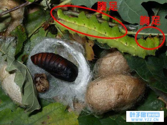 柞蚕的幼虫、茧和蛹,注意它的五对腹足和三对胸足。图片:BioPix