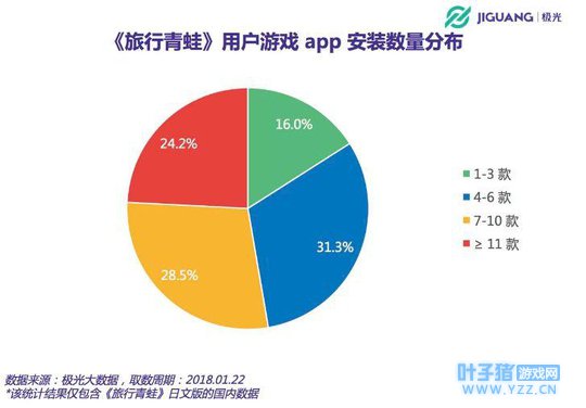 这就是风靡一时的《旅行青蛙》,在历经了这个农历春节后,发现这款游戏在朋友圈的话题性已经大不如前,因此不少人感慨这只青蛙已经“凉了”。 但事实上,《旅行青蛙》不但没有“凉”,更有可能在更适合自己的泛娱乐土壤中,以其他形式来释放这个IP价值,或许还能再度引领某种小众文化的现象。 需要不一样的衡量参数 与《王者荣耀》、《绝地求生》这类游戏不同,《旅行青蛙》体现出来的是一种轻量化状态,游戏本身并不是不再是高成本、偏硬核、具有竞技性的代名词。 所以,用玩家在线时长、下载量等传统衡量游戏是否火热的指标并不适合,相比在屏幕前紧张地完成精妙操作,在《旅行青蛙》中,玩家只是在有空的时候打开行囊菜单,为儿子收四叶草,招待来串门的朋友,然后有时候儿子会看书,会发呆,有时候又出远门旅游,给你带回明信片或者当地特产,但是这些行为是完全随机的,不受玩家控制。 甚至,玩家都不需要每天在线去跟进,有时隔段时间再进入游戏,蛙儿子往往会给玩家带来很多意想不到的的惊喜。 根据极光大数据显示,《旅行青蛙》的用户以游戏中度玩家为主,所有用户中有6成用户安装了4到10款游戏,只有16%的用户安装了1到3款游戏。再根据《旅行青蛙》的轻量化特征,就可以直接推导出这种场景,就是《旅行青蛙》基本上是作为《王者荣耀》、《绝地求生》这类游戏的补充存在,是在玩家厌倦了那种高精度操作后,在寻求一种新颖、轻松的游戏方式。
