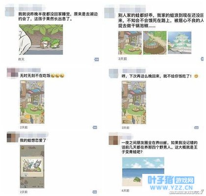 据百度指数显示,《旅行青蛙》在1月中旬创造了游戏搜索神话 今年初,微信朋友圈被一只青蛙占领。从“我的蛙儿子怎么还不回家”到“我的崽啊,什么书你能读一下午啊”,议论的话题从单纯的“盼儿归”衍生出“读书读傻”、“相亲恋爱”等多种诙谐版本。在这场汹涌的晒蛙狂潮中,网友们也从空巢已久的慈祥老母,变成了“唯恐天下不乱”的段子手。