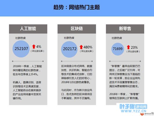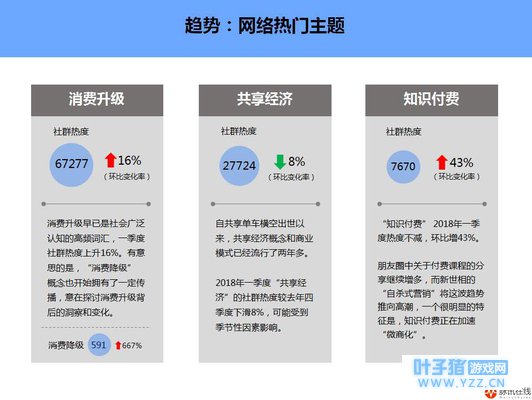 趋势篇 本篇章记录了人工智能、消费升级等热门概念和主题的网络传播热度。 与去年四季度相比,除共享经济外,其它热门主题2018年的社群热度均在上升。区块链则迎来了一轮爆发。