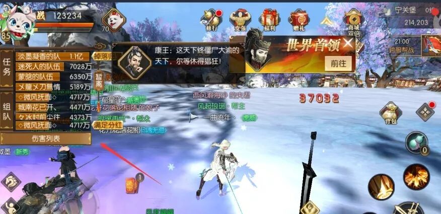 在大家一起消灭世界首领的时候,左边任务界面会出现一个伤害列表,没有出现也不用着急点一下伤害列表的字样就会出现了,上面会显示你所在的队伍的伤害排名,以及伤害量