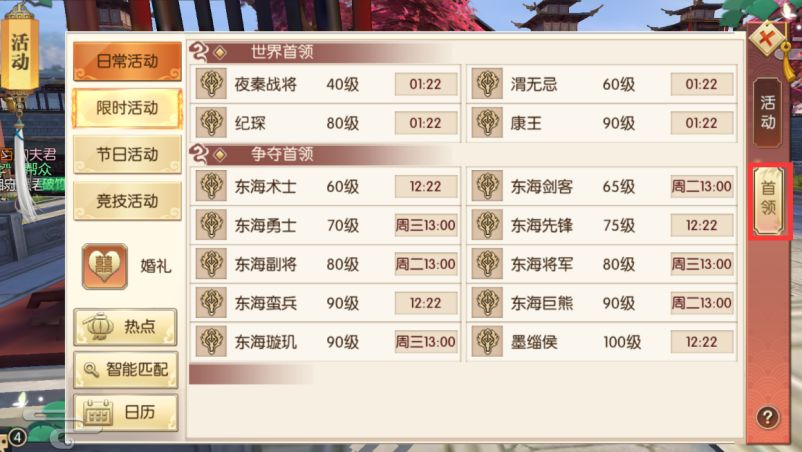 想弄清楚这个首领到底该怎么玩,大家在界面的右上方的活动中选择首领一栏就可以看到首领的各个信息,这样对于琅琊榜中的首领有个大致的了解。