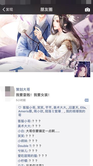 先不要管小白 破坏了队形 这件 无关紧要 的事情 一向成熟稳重温柔内敛的 策划大哥 突然在朋友圈 放飞自我 耍贱、女装、这种平日里都是 小白专属 (误)词汇 怎么会出现在他的词典中? 难道说因为 工作压力太大 ? 或者是他遇到了什么 难事 心态崩盘?