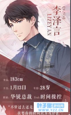 根据BLACK SWAN档案揭秘:他穿越阴谋与危机,再一次出现,在我的生命里。十六岁的银杏雨又落下,他的胸膛里是让人安定的心跳。“我不会让你陷入危险——只要你在风里,我就能找到你”。 4.霸道总裁李泽言 一言不合就要怼你,霸道任性不讲道理的李泽言,是四人当中粉丝最多,人气最盛的国民老公,钱多帅气是他最致命的武器,是女玩家们争相追捧的主要角色。