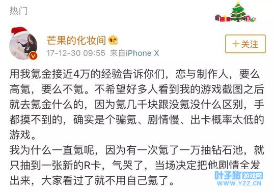 但是, 这些甜蜜并不是免费的。 浪漫情节的推动主要是靠收集“羁绊”卡,而集卡的方式类似于《阴阳师》,你需要不同程度的氪金或爆肝才能尽可能快地推动游戏进程。 从《恋与制作人》如今的风靡程度看,玩家们似乎一点也不介意花钱购买浪漫情节。游戏的忠实粉丝,已经戏称游戏为《钱与野男人》,意指这款游戏的氪金之多。尽管如此,在微博上, 已经有人为了这个游戏花费了上万元。