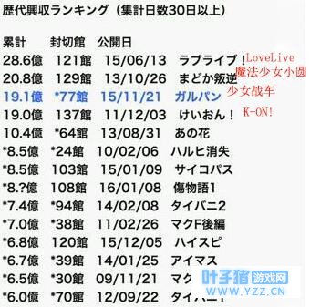 热度只是一方面,看到这个投票结果笔者最初的反应还是:“女性观众比例真高啊!”随后联想到近期热议的关于女性市场的话题,笔者不由想到,“百合”题材是否也是开拓女性向市场的好方向呢? 男女通吃:梦幻般的细分品类 “百合”是一个根正苗红的二次元词汇,源自于1976年在一本原本面向男同性恋者的杂志《蔷薇族》上开辟的专栏“百合族的房间”,蔷薇与百合从此成为男女同性恋的代称。 在上文看到的调查结果中,我们可以发现,百合作品的女性受众十分众多,甚至超过了男性。显然,如果把目光局限在女性市场中,百合题材完全能够排在腐女向、乙女向之后,成为一大热门品类。而事实上,百合题材并不只有对女性用户亲和力高这一个亮点。 鉴于国内游戏对女性向市场的发掘还处在刚刚开蒙的时期,有许多空白的研发方向都在等待着爆款游戏的出现,百合向游戏相比于腐女向和乙女向游戏还有着另一个难以比拟的优势——它在讨好女性用户的同时不会将男性玩家拒之门外,这一优势使得研发百合题材产品的风险大大降低了。在GAY、女装、逆后宫等概念不断地冲击中国网民观念的当代,“百合”显然也是一个具有相同特质、拥有广泛受众的题材,只是还缺乏一个使它传播流行起来的契机,和一款打破沉寂的游戏。 在百合文化的发源地日本,虽然也并未出现一款现象级的百合向的游戏产品,但在动漫产业中百合题材的潜力已经显露出来。下图是一张日本深夜动画剧场版票房统计图,其中排名前四且遥遥领先的四部作品分别是《LoveLive》、《魔法少女小圆——叛逆的物语》、《少女战车》、《K-ON!》。