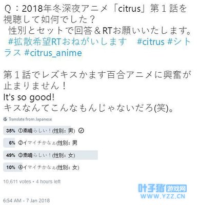 剧情只是王道的百合剧情,然而开播之后的人气却相当亮眼。在日本推特上针对1月新番第一集观看体验的投票中,《citrus》收到了上万张投票,是仅有的两部票数过万的新番之一——另一部是超级话题作品《pop子与pipi美》。而在国内持续引发讨论热潮的《紫罗兰永恒花园》也不过收获了三千五百票而已,还不到《citrus》的三分之一。