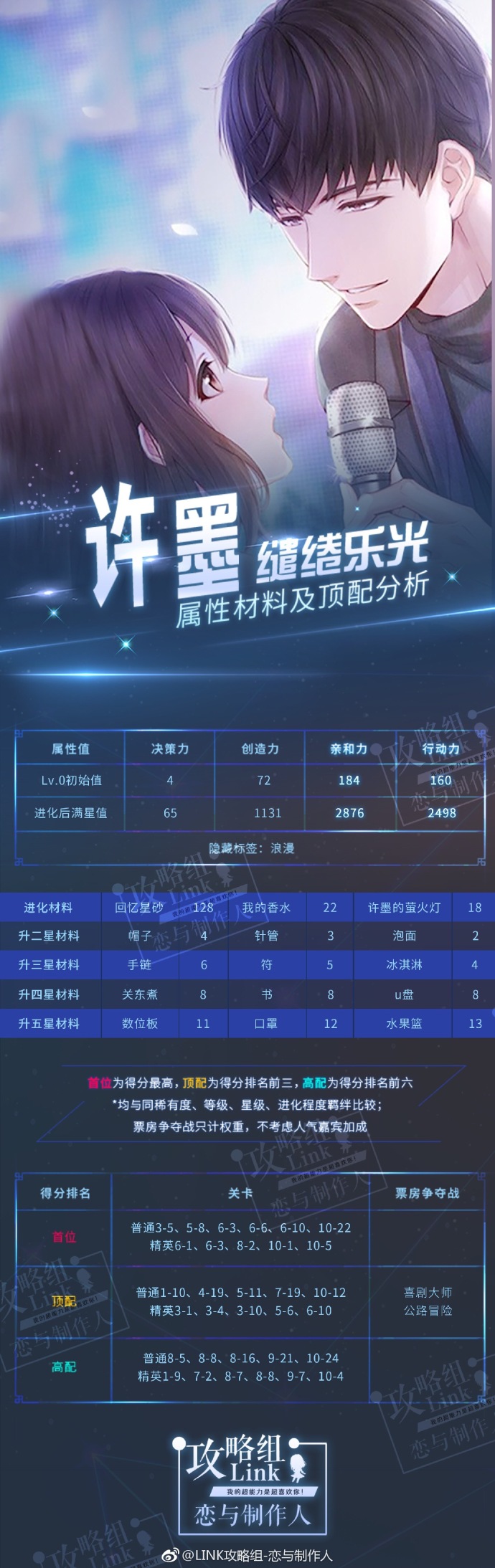 各位制作人晚上好! 今天小编给大家带来了 许墨·缱绻时光 的活动攻略~内附本次活动的 消耗分析 和 顶配分析 。 消耗分析 :最低消耗 2300钻 ,详细见图 顶配分析 :【 许墨·缱绻乐光 】 属性材料 及 顶配分析 ,你想知道的一切,统统告诉你~ 祝各位食用愉快~ 小贴士: 每天刷完票房争夺战时候把出场卡牌换成 N卡 ,能够帮助到第二天的连胜哦~票房争夺战详细攻略戳这里 另外,据可靠消息,【 许墨·缱绻乐光 】的 约会剧情 以后将会开放!