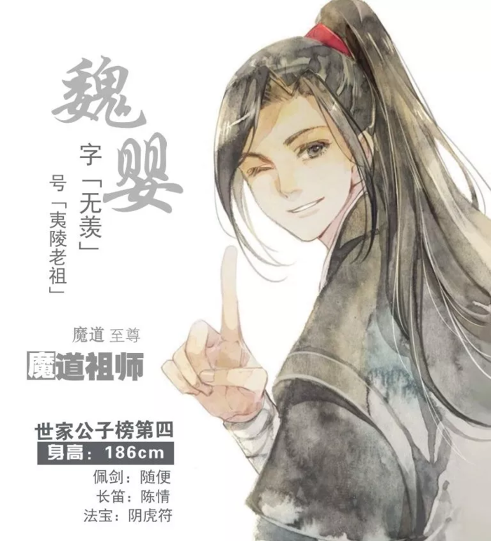 CP:蓝忘机(攻)×魏无羡(受),1V1主角受HE。前世今生双线剧情向,夫夫携手解谜打怪打孩子。 蓝忘机、魏无羡为双男主。小说中构建了姑苏蓝氏、兰陵金氏、云梦江氏、清河涅氏、岐山温氏、秣陵苏氏六大姓氏,涉及魏无羡、蓝湛、江澄、金光瑶、金凌、温宁等约30人设;以及义城篇的薛洋、晓星尘等4人设。以下为人物关系图: