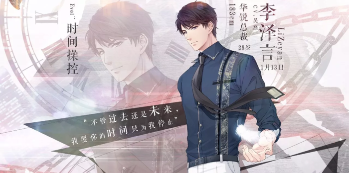 游戏中每个角色的声音都像是偶像剧男主角的配音,这样的音色搭配的是『傻瓜,小心烫』、『今天,我是只属于你一个人的周棋洛』、『希望你不要那么笨、那么傻,也别那么容易相信别人,但是,必须要相信我』等这样的台词。另外,动不动就有吻额头、壁咚、耳语、背后拥抱、摸头杀、公主抱等戏码,让少女我无所适从。 《恋与制作人》男主人设 李泽言: 金融帝国霸道总裁,冷酷严苛但会做饭