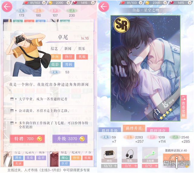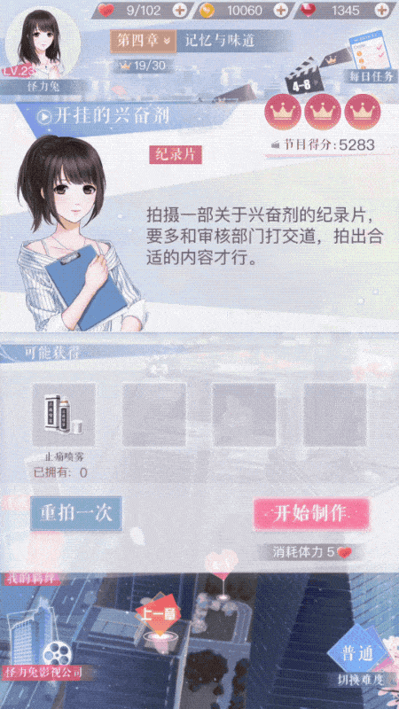 普通和精英副本掉落不同的材料用以升级羁绊卡牌 游戏的主线是雇佣可靠的专家,通过羁绊关系寻求男主的帮助,继而制作出观众欢迎的电视节目。 节目的星级评定由公司本身能力、特殊事件反馈、羁绊关系决定,每项都涉及创造力、亲和力、决策力、行动力四种指标,可通过卡牌的升星、进化以及雇佣专家和部门培训等提升。 而围绕主线的设定包括约会、拍摄副本、城市资讯、票房争夺战等等,既切合主题又与主线构成了良好的闭环。