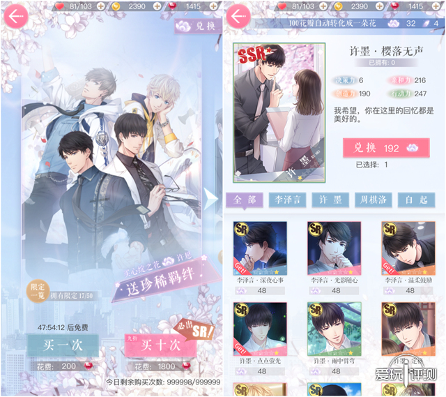 SSR的稀有及高属性加成促使玩家忍不住氪金 《恋与制作人》打开游戏便笼罩着粉嫩的少女气息,温和轻柔的用色、浪漫唯美的场景、日漫画风的男主,配上漫天飞舞的樱花花瓣和点点星光,在氛围的营造上下足了功夫,寒冷的冬日里将女玩家引入一个暖融融的粉色空间。