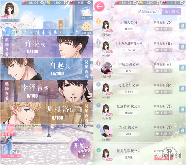 好友系统和“城市漫步”相对鸡肋 这是一个很容易就能在社交功能上做文章的类型,然而游戏中玩家间的互动贫弱,除了加好友、互赠体力外,仅剩异步PK提升排行榜名次,在社交和互动方面《恋与制作人》还有很大的探索空间。 虽然在游戏里几乎靠自嗨,但游戏外的延展却令人意外,以男主为原型的同人小说、明星影视片段剪辑合成、聊天cosplay、微博话题、心理测试、网络新梗和表情包等等纷至沓来,这些营销层面的拓展为《恋与制作人》的宣传不断助力。