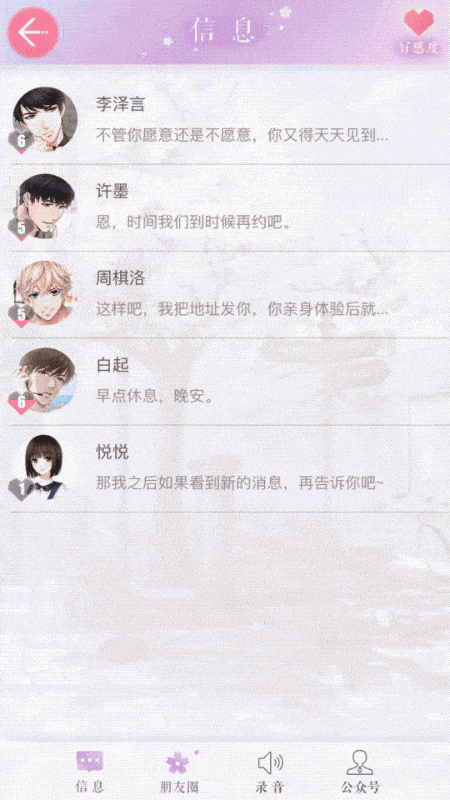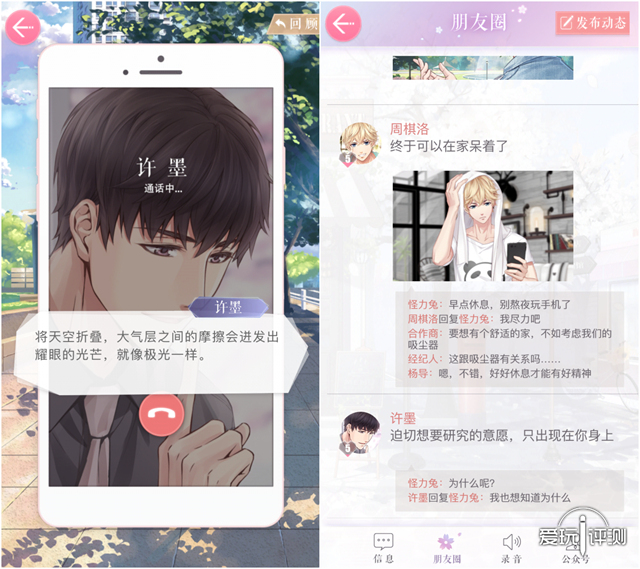 贴近生活的微信、朋友圈、通话设定 除了声控福利的对白,本作最具特色的大概就是将现实生活的社交方式带入游戏,当天才科学家许墨在朋友圈里给你留言,帅痞的白起警官不时打来电话担心你的安全,超级巨星周棋洛会秒回你信息,邀请你一起吃Souvenir的布丁时,混入现实的虚拟互动不断增强着代入感,以至于我会幻想着李怼怼等待在楼下接你吃饭。