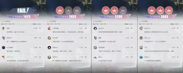 核心玩法关卡被包装为制作一期影视节目。玩家需要选用特定标签的专家卡牌与特定属性的羁绊卡牌,提升节目评分。通关过程缺乏策略与操作,只是生硬的数值验证。关卡结算界面有亮点:节目评分0-3星,“观众留言”截然不同(插图)。界面酷似微博,留言中熟练运用网络流行语,这些目标用户所熟悉的形式与内容带来了代入感、趣味性,表现力大幅提升。
