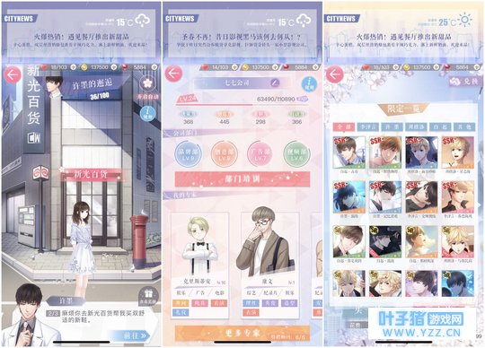 《恋与制作人》将这种细节增加好感度的方法学习并本地化并创新,游戏中的“朋友圈”模式,不得不说是游戏创意和趣味性的集中体现。和现实的微信朋友圈一样,和女主角有关的好友,都会在朋友圈下留言、回复。对一个角色的所思所想发出来的状态,会产生一对一、一对多的评价模式,在其中既能捕风捉影故事的走向,也能发现不同角色之间的联系。相比平铺直叙的对话,这种方式的剧情汲取可谓形散神不散,于笔者而言,这个系统的趣味甚至大于来电、短信的单刀直入,会让人很快陷入游戏的剧情人物里。 系统上,除了主线的关卡推图,SSR的抽卡也是标配。辅助卡面数值的系统有专家、资讯调查、公司实力等,城市漫步则是纯挂机的玩法,卡面收集既可以收集立绘也能够收集剧情,让收集的元素渗透在整个游戏中。这样看来,游戏系统还是相当丰富的。而一些细节的设计,比如攻略的角色可以修改微信昵称、通话背景,实为增加了玩家与角色的互动和关联性。