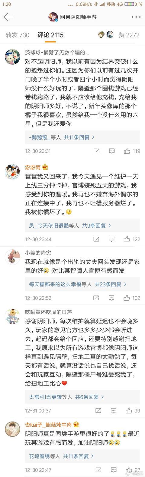 广大入坑妹子一开始疯狂安利闺蜜朋友,然而昨天等到凌晨依然停服维护的时候瞬间翻脸,表示后悔安利,结果自己进不去游戏了。 《恋与制作人》停服,隔壁《阴阳师》官微评论炸了,《阴阳师》在一夜之间成为最大赢家。来感受一下妹子们的愤怒。