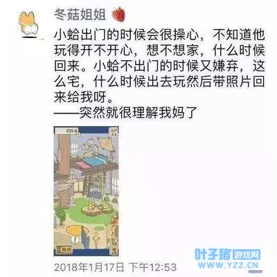 有人说 这个游戏让人情绪安定 他不会让我付出很多 也不会伤害我 虽然 他不受控制 也不属于我 却反而让我溢出来的爱心能够被妥善安放 对很多人来说 也许《旅行青蛙》相比于父母之爱 更像一种不被束缚、也无法解开的牵绊吧