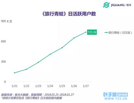 截至1月27日,《旅行青蛙》日文版的日活跃用户数已经突破700万大关。考虑到这款游戏在国内的话题引爆时间点为1月中旬,其增长势头之迅猛由此可见一斑。