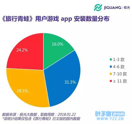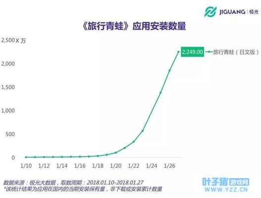 从安装数量的曲线走势可知,这款游戏在国内经过短暂的发酵期后,从1月中旬开始进入快速增长期。根据极光大数据的统计结果,截至今年1月27日,《旅行青蛙》日文版在国内的安装数量已经达到2,249万。