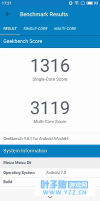 可以看出魅蓝S6凭借着拥有A73大核心的三星7872处理器跑出了9万几的分数,这个分放在不足千元的市场上来看,已经是非常难得了,CPU的运算分数为45443分,已经达到了骁龙653的水准,在GPU方面的分数则为13440分,与高通的一代神U——骁龙625的GPU分数相差无几,这些都为良好的游戏体验打下坚实的基础。 看性能测试可不能只看一家,所以下面就来看看魅蓝S6在Geekbench上的分数表现: