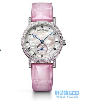 宝玑2018年情人节限量款——Classique经典系列9085女士月相腕表,全球限量14枚 每一枚都有一个独立编码,从01/14至14/14,只为宣告,唯有心爱的她,才是独一无二。12点钟位置的表圈及表耳镶嵌13颗明亮式切割钻石,6点钟位置的表圈及表耳镶嵌53颗渐变粉色蓝宝石,连搭载的月相显示也是“心”形的模样,在珍珠母贝上做该形状的切割不仅对珍珠母贝的选取,还是对切割工艺的要求都是严苛而困难的,披荆斩棘,只为在心爱的她面前呈现最好的。