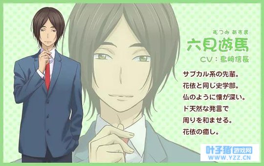 六见游马,次文化部的前辈,是个温柔呆萌,有密集恐惧症的帅哥。 四人中唯一一个在面对胖版花依时就注意到她温柔本质的博爱帅学长, 完全不会因为花依的胖瘦而改变对她的态度。 即使在花依干掉一篮子巧克力一夜胖回解放前时, 其余三人都想方设法鼓励花依减肥, 只有他没有那么做。 最终意识到自己对花依的朦胧心意,向其表白。