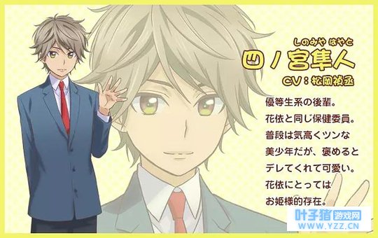 四之宫隼人,“四五六七”四大帅哥中的一员, 是学校里优等生系的后辈,和花依同样是保健委员。 看似沉默寡言,实则外冷内热,是个十分禁不住夸的高冷美少年。 在他的认知里,花依就是公主一般的存在, 为了让花依对自己刮目相看,曾假装自己学会了冲浪,并在鬼屋时故作镇定, 当然都失败了。
