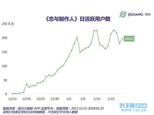 《恋与制作人》和《旅行青蛙》是近期先后火起来的两款游戏,并且都是瞄准女性作为其主要用户群。 极光数据的数据显示,《恋与制作人》目前活跃用户已经进入稳定期,《旅行青蛙》(日文版,下文均指同义)依然处于高速增长期,目前安装量已经突破2000万。 从下图可以看出,12月18日进入快速增长的阶段,1月14日以后,《恋与制作人》的安装量基本进入平稳震荡期。1月7日后,日活也进入震荡期。