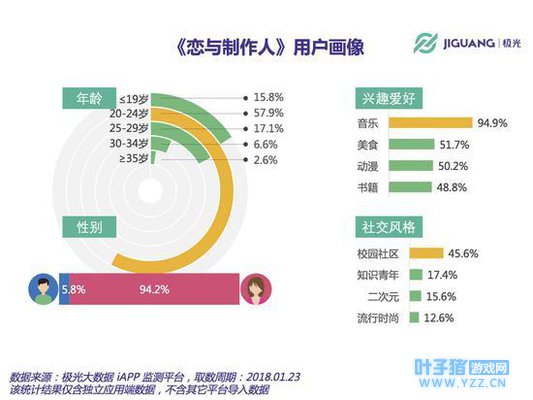 先来看下《恋与制作人》,这是一款备受女孩青睐的恋爱经营手游。女性比例占94.2%,20—29岁居多,共计占75%,也就是对爱情需求最强烈的年轻女性是其核心用户。社交风格中,校园社区占45.6%,表明在校学生占据了相当比例。