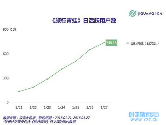 相比之下,《旅行青蛙》正如日中天。从该游戏被讨论的舆论热度也也想而知。从1月20日起,《旅行青蛙》进入了为期一周的指数级增长。截至1月26日,青蛙游戏国内安装量超过2200万,日活超700万。