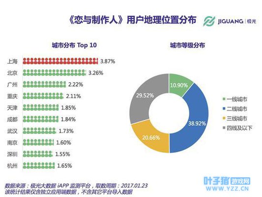 从用户的地理位置分布上来看,《恋与制作人》虽然在北上广三个一线城市的用户最多,但是综合来看,这款游戏在二线城市的占比较大。
