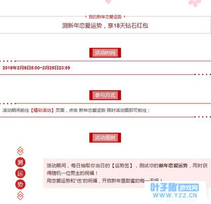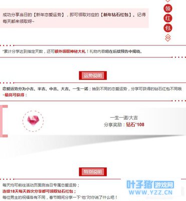 特别说明 福袋说明 1.新春超值福袋,新春有礼!【新春超值福袋】新春专属价只要188元!限购1次。 礼包含有:星河许愿券*10,曦光许愿券*10,羁绊诺言*72,体力*1200,金币*12万,告白心愿*28,三星课程卡*4 2.新春超值福袋,新春超值礼包,每日限购1次。仅售3元,物超所值~ 礼包含有:钻石*30,体力*88,金币*8888,牵绊心愿*8 春节限定SSR/SR概率公示 2018年春节限定羁绊概率up活动涉及概率公示: 1.单次购买心绽之花,赠送春节限定SR羁绊的概率:4.3% 2.单次购买心绽之花,赠送春节限定SSR羁绊的概率:1.5% * 同时,许愿树常驻R卡概率在活动期间有相应的下调,在活动结束后恢复。 其他活动爆料 接下来是关于情人节的最新爆料哦!图片均来自微博网友爆料~