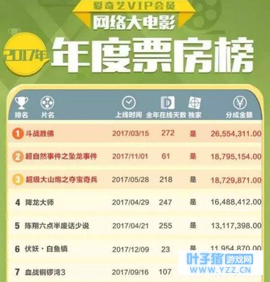 在网路电影市场中,开发“她经济”也是一个热门话题。但是目前以17年的数据来看,除去上半年在乐视播出的,以女性为主要受众的系列网络电影《总裁在上》在市场中取得一定的影响外,其余成绩靠前的网络电影基本还是以男性用户为目标受众。 以爱奇艺公布的2017年网络电影中分账榜单来看,榜单的中不论是以西游题材为卖点的《斗战胜佛》、以高制作高特效标榜的《超自然事件之坠龙事件》,还是搞笑的东北喜剧《超级大山炮之夺宝奇兵》等作品中,“她经济”成分都较少。