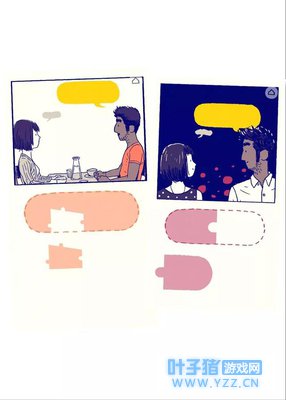 正式遇见他,和他有了联系那一天,在游戏里叫做碰撞。在这里游戏设置是这样的,两个标尺,像是转动相机聚焦环一样,我们调动标尺,对方模糊的样子慢慢地清晰。印在我们彼此眼中,心里。 接下来是约会。坐在彼此的对面,有点相顾无言。对话框是一个拼图,像是我们在内心谨慎又紧张地遣词造句。