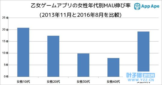 另外,据App Ape的调查显示,乙女游戏的50岁以上玩家数量从2013年到2016年间增加了19倍,也就玩乙女游戏的50岁以上女性玩家甚至和10-20岁的年轻女性玩家数量基本持平。
