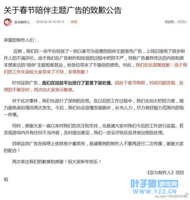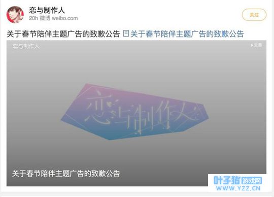 昨日(2月18日),《恋与制作人》通过官方微博发表道歉声明,称已紧急下架了这则广告↓