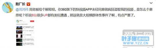 事件一出,B站立刻就发布了声明表示要调查追责到底,同时一些被盗传视频的知名UP主门也开始发声。比如著名的星际主播黄旭东就直接质问了360老板周鸿祎,同时敖厂长、暴走漫画、共青团中央都在微博表示自己并没有在360快视频上发布自己的视频内容。
