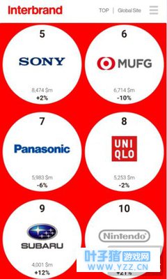 我的名字很值钱!索尼成日本最有价值品牌TOP5 ! 一个公司到底有多值钱,除了看它的资产之外,还有一个就是看它的品牌价值。本周,美国著名的市场调查公司interbrand就公布了一份日本品牌价值榜的榜单。其中丰田、本田、日产包揽了前三名,而索尼仅次于佳能排名第五,任天堂则勉强挤进前十。