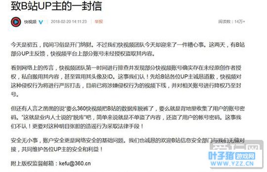 不问自取视为盗!360 快视频陷侵权门! 如果要评中国最闹腾的互联网公司,那么360肯定能够排名前列,比如著名的3Q大战,以及360老板周鸿祎各种惊人论调,都让360一直处于舆论的风口浪尖之上。 就在本周,360又成为了一时的热搜,而这次惹祸的就是360旗下的360快视频。据网友爆料,360快视频中有着大量B站UP主制作的视频,而这些UP主并没有在360快视频上注册账号;甚至有网友还发现可以直接用B站的账号登陆360快视频,所以立刻让人怀疑360快视频“克隆”了整个B站视频库并盗取了B站用户的账号密码。