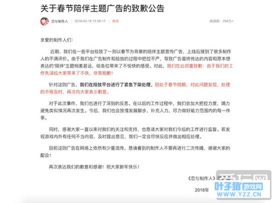 玩家全是花痴?《恋与制作人》官方广告惹祸了! 可能玩家们都知道,新年假期对于很多手游来说,都是难得的宣传机会。因为回老家过节,玩的最多的就是手游了。作为去年的爆款游戏之一的《恋与制作人》也在春节期间制作了一则广告。 但是,这则广告一上线,立刻就被骂上了热搜。原来,在广告之中把游戏玩家都塑造成了只会沉迷游戏,颠倒现实和虚拟的花痴女,并且里面有众多的低素质和脑残的表现,简直就是把玩家们都“一黑到底”。所以广告上线不到一天,微博上就出现了各种抗议和要求道歉的言论。最后,官方不得不被迫下架了广告,并发表了道歉声明。