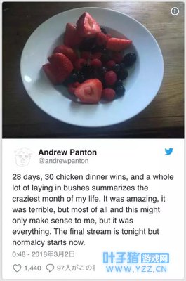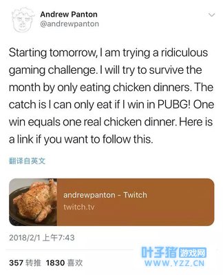 大概内容是,在一个月时间内,Andrew Panton除了烤鸡,不能吃其它任何食物。但烤鸡也不是随便吃,条件是他需要在《绝地求生》里成功吃鸡,每吃鸡一次就奖励吃一只烤鸡。Andrew Panton如果能坚持一个月不死,就算挑战成功。