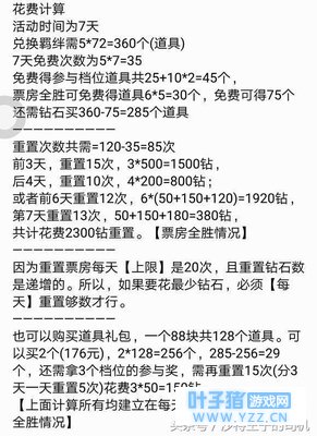 重置票房次数所需钻石 1-5次,10钻。5*10=50 6-10次,30钻,5*30=150 11-15次,60钻,5*60=300 16-20次,100钻,5*100=500 参与档位道具 参与5-25次得5*5=25 参与30-50次得5*10=50 参与55-75次得5*12=60 参与80-95次得4*15=60 参与100-110次得3*20=60 参与115次得30 参与120次得50 参与125次得70 赢得票房争夺战获得奖励 6*5=30个