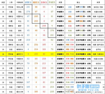 温柔灯火:决策4、创造210、亲和81、行动181、创造行动双极限卡。 由于决策创造是差亲和行动两三千基础分,叠纸至少出3年决策创造才能赶上亲和行动的分。所以决策创造这两年一直会是稀有属性。决策创造为主属性的双极限卡都是必须入的。但是如果你有更好的3张SSR,你可以不要这张卡。但考虑到怼怼的创造不是很多,对拍摄副本有想法的,也是可以入这张卡的。特意标注一下。